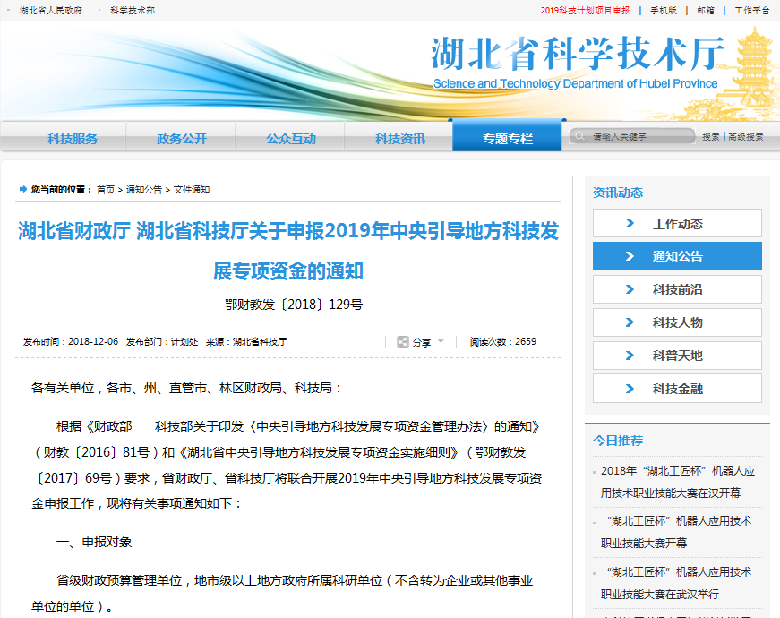 根據(jù)《財(cái)政部 科技部關(guān)于印發(fā)〈中央引導(dǎo)地方科技發(fā)展專(zhuān)項(xiàng)資金管理辦法〉的通知》(財(cái)教〔2016〕81號(hào))和《湖北省中央引導(dǎo)地方科技發(fā)展專(zhuān)項(xiàng)資金實(shí)施細(xì)則》(鄂財(cái)教發(fā)〔2017〕69號(hào))要求,省財(cái)政廳、省科技廳將聯(lián)合開(kāi)展2019年中央引導(dǎo)地方科技發(fā)展專(zhuān)項(xiàng)資金申報(bào)工作,現(xiàn)將有關(guān)事項(xiàng)通知如下: