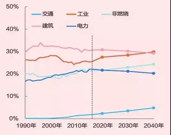 在結(jié)構(gòu)轉(zhuǎn)變過(guò)程中,不同領(lǐng)域的能源消費(fèi)變化同樣顯著。BP、ETRI、IEA都注意到,全球范圍內(nèi)工業(yè)部門(mén)能源消費(fèi)增長(zhǎng)在逐漸放緩,建筑是增長(zhǎng)最快的部門(mén)。工業(yè)部門(mén)能源需求在2040年達(dá)到峰值,之后保持穩(wěn)定,并且電氣化率還將不斷提高。BP認(rèn)為,天然氣和電力將滿(mǎn)足未來(lái)工業(yè)領(lǐng)域能源增量,2040年成為工業(yè)部門(mén)主要能源。